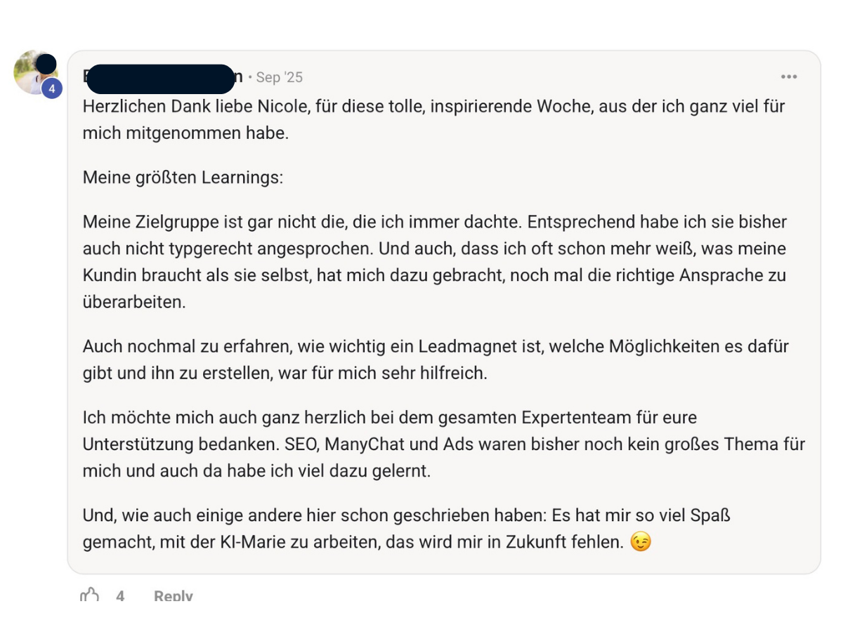 „Ich dachte immer, Verkaufen muss anstrengend sein. Nicole hat mir gezeigt, wie es leicht geht – und trotzdem funktioniert. In 3 Monaten habe ich mehr eingenommen als die 6 Monate davor.“