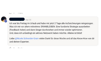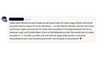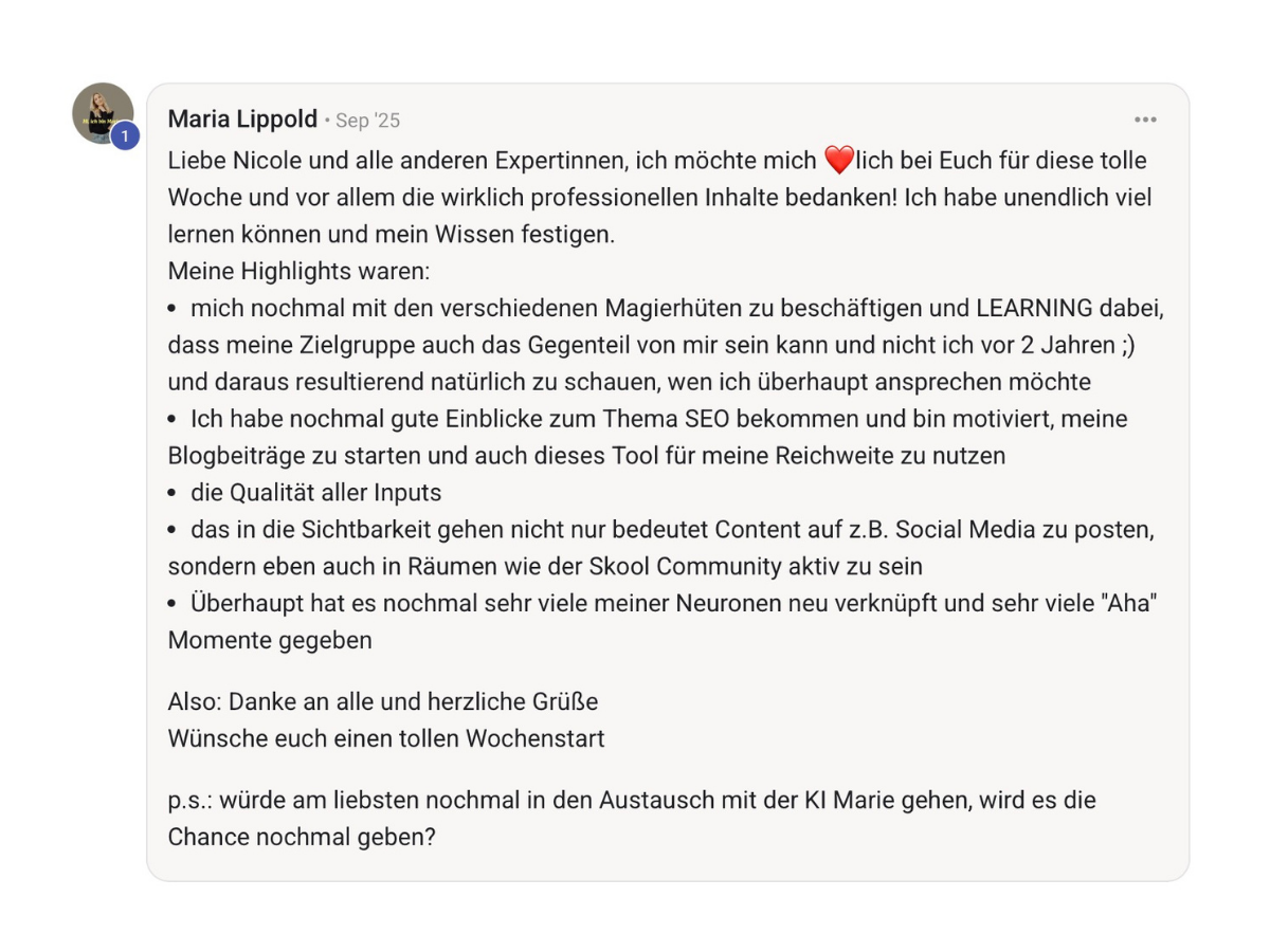 „Vor der Zusammenarbeit hatte ich zwar viele Ideen, aber keine Struktur. Nach nur wenigen Wochen im Schauplatz hatte ich ein klares Angebot, meine erste Leadmagnet-Strategie und die ersten 2 zahlenden Kunden."
