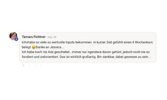 Performance-Marketing-Expertin für Meta Ads. Jessica bringt dir bei, wie du bezahlte Anzeigen strategisch nutzt, um gezielt Interessenten für dein Angebot zu gewinnen.